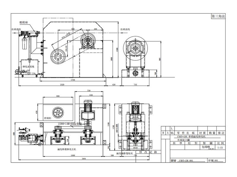 2. 機(jī)器型式 : 伸線(xiàn)輪水平高、低排列,雙伸線(xiàn)輪獨(dú)式.